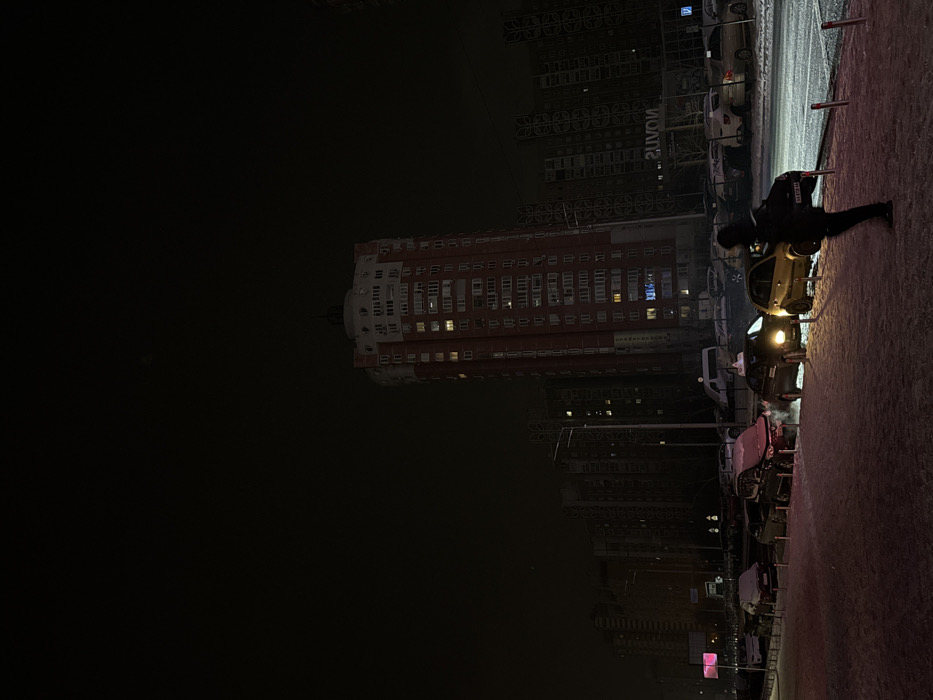 Night scene captures a tall brick building illuminated by internal lights. Adjacent, multiple vehicles line a snowy street, with a person walking nearby. High-rise buildings with scaffolding stand in the background. The street is partially lit, casting reflections on the snow-covered ground.