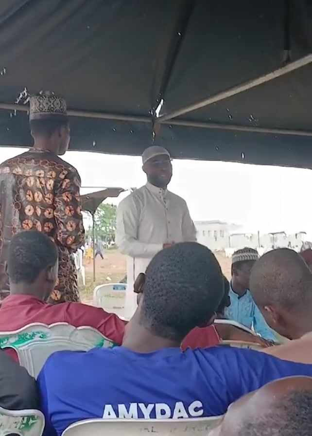 gathering of people under a dark canopy. Most of them are seated on white plastic chairs. A man in a white robe and cap is standing and speaking to the group, gesturing with his hands. Another man in a patterned robe and cap walks towards the speaker. Many of the seated individuals have their backs to the camera. One man is wearing a blue shirt with "AMYDAC" printed on the back. There are other canopies and buildings visible in the background.