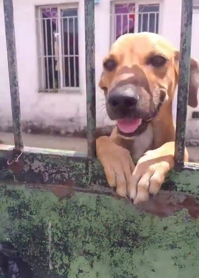 A friendly brown dog places its front paws on a green barred gate. The dog is in front of a white building with two windows. The video quickly moves away from the dog to the building. The dog runs from behind the gate to the building.