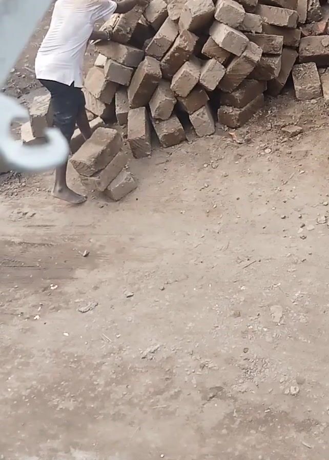 From a high-angle perspective, the video shows a person in a white shirt and dark pants crouching next to a pile of light-colored bricks on a dirt or concrete surface