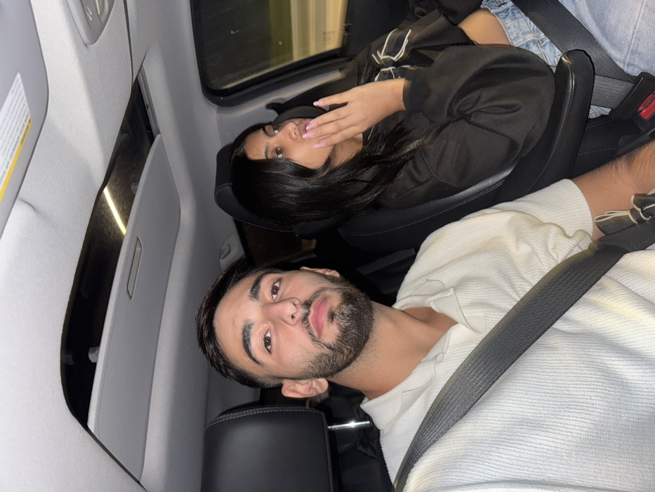 young adult male and a young adult female seated in the front passenger compartment of a vehicle during nighttime, in the city of Unknown, Israel