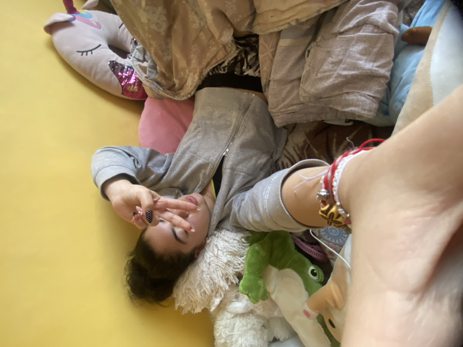 This image depicts an indoor scene within a room located in Gabrovo, Bulgaria. A single female individual is centrally positioned, reclining with her head resting on a white, fluffy pillow against a solid yellow wall. Her dark hair is pulled back into a bun. She wears a grey zippered hoodie over a dark top, with dark-patterned shorts visible beneath. Her left hand is raised to her face, forming a V-sign with her fingers, partially obscuring her eyes. Her fingernails are painted, featuring pink polish and black polka dots on one finger. Bracelets are visible on her left wrist, including a red string, a white braided band, a gold-colored charm, and a silver-colored ring. To her right, a pink square pillow is visible, followed by a light-colored unicorn-shaped neck pillow with a pink sequined patch. Various textiles, including a light brown textured blanket, cover portions of her body and the surface she rests on, which appears to be a bed or sofa. To her left, a green frog-like stuffed animal and other light-colored stuffed toys are present. A white cable is partially visible near the green stuffed animal. In the immediate foreground, the sole of a bare human foot is visible, angled towards the lower left of the frame.
