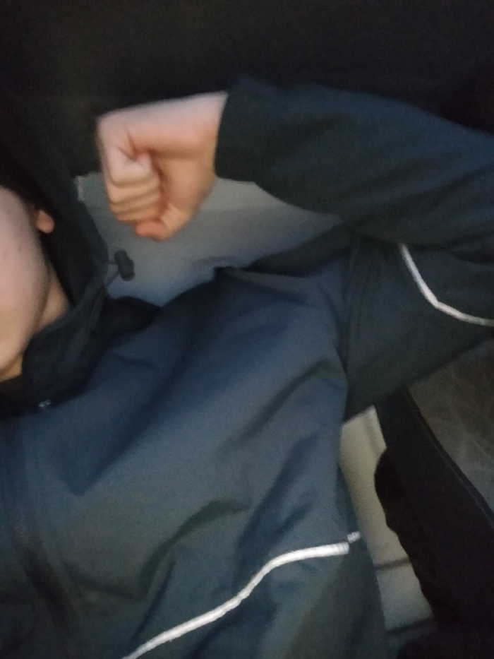 This image depicts a partial view of an individual within an interior setting in Tsaratsovo, Bulgaria. The subject's upper torso, left jawline, and chin are visible, positioned off-center to the left. They are wearing a dark-colored, likely black or dark blue, hooded jacket or sweatshirt featuring a prominent white horizontal stripe across the lower front. The subject's right arm is bent at the elbow, with the hand clenched into a fist, indicative of a bicep flexion. The background is dimly lit and largely indistinct, showing a lighter, possibly wall-like surface behind the subject's arm and a darker, textured object or surface to the right of the frame. Illumination appears to originate from the front, highlighting the subject's skin and the white stripe on their garment.