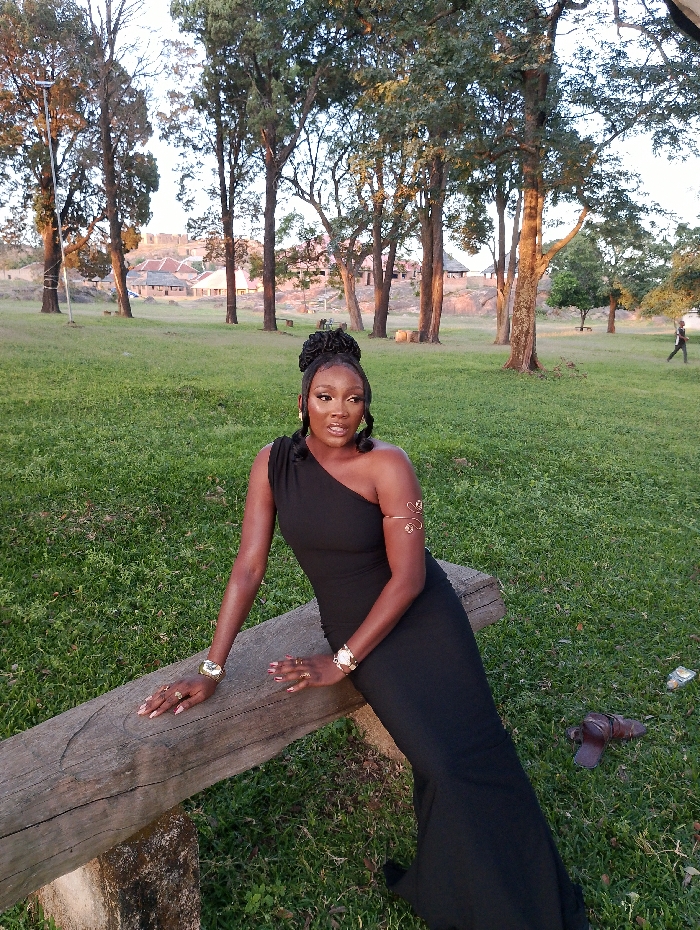 A dark-skinned woman in a black, one-shoulder, form-fitting gown is positioned leaning with both hands on a weathered wooden log bench in an outdoor grassy area