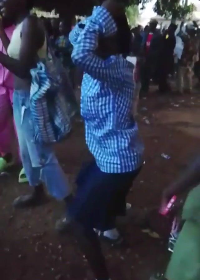 young girl dancing in an outdoor gathering, likely a celebration. She is wearing a blue and white checkered shirt, a dark skirt, white socks, and sandals. She moves her arms and body to the rhythm. Other people are visible in the background, some dancing and others watching. The ground is dirt, and there are some discarded items scattered around. The lighting is dim, suggesting it is either late in the day or under shade. There is a tree visible overhead. The overall atmosphere is festive and lively.