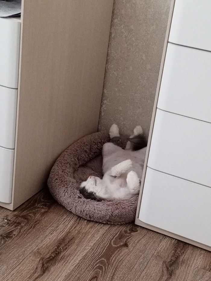 Location: Unknown, Unknown. A domestic cat, predominantly white with gray markings on its head and tail, is observed resting supine within a round, plush, light brown pet bed. The cat's front paws are curled near its chest, and its back paws extend upwards. The scene is set indoors, on a light brown laminate floor. To the left of the cat is a vertical panel of light beige furniture. Behind the cat, a textured, light gray wall is visible. To the right of the cat is a white furniture unit, appearing to be a chest of drawers or wardrobe, with visible horizontal seams. The cat exhibits no apparent movement.