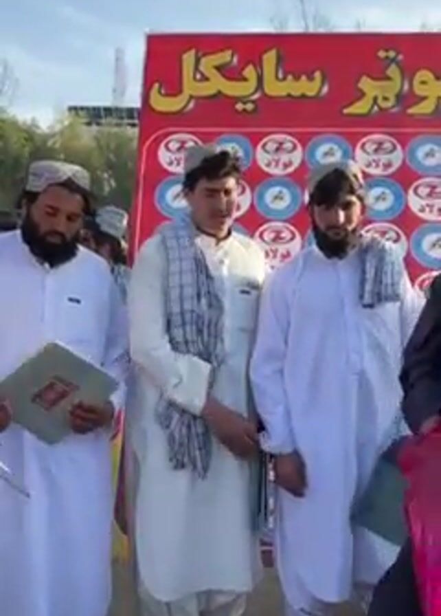 group of men standing outdoors. Most of the men wear traditional clothing, including a long white shirt and loose-fitting trousers, along with headdresses. One man wears a dark vest. Several men hold papers or folders. A man in the front speaks and gestures with his hand. Behind the men is a large sign in a language other than English, featuring the word "Foolad," which may translate to "Steel" in English, along with images of circles. The background includes buildings and trees under a partly cloudy sky.