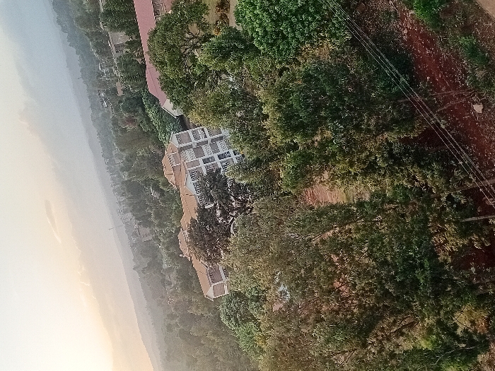 The scene presents an elevated panoramic view of Karingani ward, Kenya, observed under soft, diffused light, indicative of early morning or late afternoon. A central multi-story building, appearing to be a residential or institutional complex, features a light-toned facade with numerous windows/balconies and a prominent brown-orange tiled gabled roof. Several other structures with similar roofing are partially visible among dense greenery in the background. The landscape is heavily vegetated with a significant canopy of diverse green trees dominating the foreground and mid-ground. Patches of reddish-brown unpaved earth are visible, particularly in the lower right quadrant and between tree clusters. Multiple strands of overhead utility lines are present in the lower right foreground. The sky is hazy with scattered clouds, transitioning from a brighter area on the left to a more muted tone on the right. No human subjects, animals, specific actions, or interactions are observable.