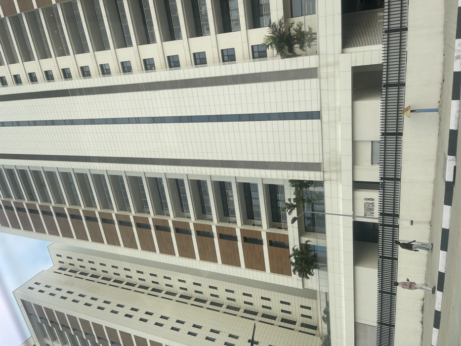 A tall, modern building with a white facade and repeating patterns of windows and balconies dominates the scene. The building is labeled "TOWER B". Palm trees are situated on some floors. A sidewalk runs alongside the building. Two people are walking on the sidewalk. The image is slightly tilted.