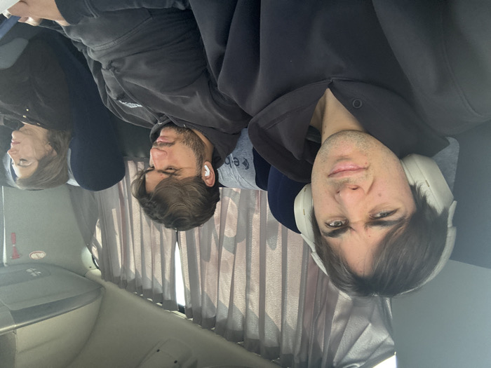 Three people sit on a bus with closed curtains. One person faces the camera, wearing headphones. Another has an earbud in and looks to the side. The last person is sleeping and is to the left. All are in darker clothing.