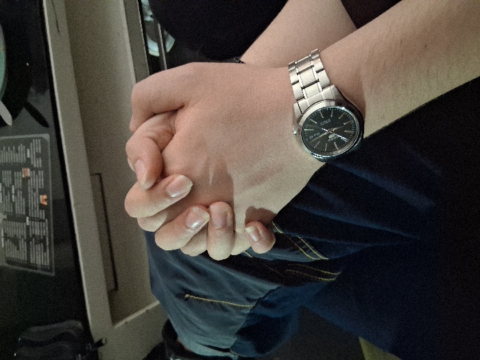 The image displays a close-up, downward-angled view of a pair of clasped hands against a dark background, likely indoors. One hand, positioned underneath, wears a silver-toned wristwatch with a dark face and light markings on its left wrist. The other hand rests clasped over the first. Both hands exhibit a light skin tone with natural, unpolished fingernails. The individual's dark blue garment, possibly trousers or jeans with yellow stitching, is visible on the left side of the frame beneath the hands. A dark sleeve or fabric is visible on the right. In the upper background, a dark surface, possibly a table, holds a translucent, rectangular object that appears to be a menu or information sheet, though its text is illegible. The lighting is subdued, suggesting an indoor setting such as a restaurant or cafe. No specific visual information in the image allows for the identification of a precise location within the city of Varna, Bulgaria.