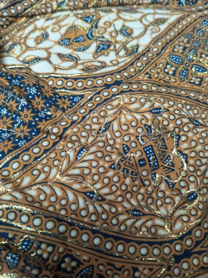A close-up shot reveals a patterned fabric with intricate designs. Dominant colors include a golden brown and dark blue, with white providing contrast. The pattern consists of repeating circular motifs, floral elements, and geometric shapes embellished with fine, shimmering gold lines. The fabric appears slightly creased or folded, adding depth to the overall texture.