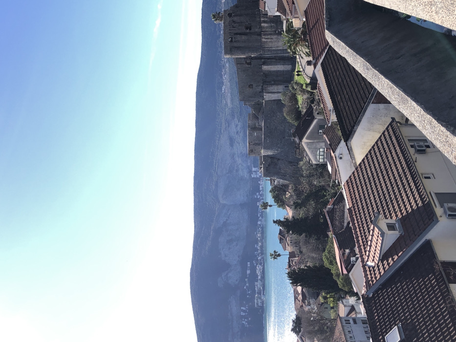 This image presents a high-angle, panoramic view of Herceg Novi, Montenegro, under clear daylight conditions. The scene is dominated by a bright blue sky occupying the upper third, transitioning from a lighter hue near the horizon to a deeper blue overhead, with a faint white streak visible in the far upper right. The background features a dark, forested mountain range spanning horizontally across the mid-ground, with visible lighter rock formations on its slopes. Below the mountains, a body of water, likely the Adriatic Sea or Bay of Kotor, shimmers with sunlight reflections, appearing a vibrant turquoise blue. Distant city structures are discernible along the far coastline. In the mid-ground, a large, weathered grey stone fortification, consistent with historical structures in Herceg Novi such as Forte Mare or Kanli Kula, dominates the right side. It features multiple thick walls and turrets. Below and to the left of this fortification, a dense cluster of residential buildings with light-colored facades and numerous red-brown tiled roofs descends towards the water. Several trees, including prominent palm trees, are interspersed among the buildings and near the fortification. A winding path or narrow road is visible between the fortification and the houses, on which two indistinct human figures are walking side-by-side, moving away from the viewer. The foreground is comprised of a partial view of more residential buildings with prominent reddish-brown tiled roofs. Some buildings display dormer windows and external air conditioning units. A solid, light grey concrete or stone barrier/railing runs diagonally across the lower right, partially framing the composition and indicating an elevated vantage point for the photograph. The sun illuminates the scene brightly, creating distinct shadows and reflections on the water.