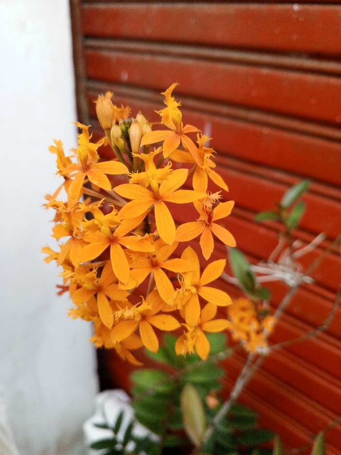 A vibrant cluster of orange flowers, possibly Epidendrum radicans, dominates the frame. They exhibit a star-like shape with frilly edges. Green leaves are visible below the floral cluster. Behind the flowers, a wall appears; one side is white and the other side consists of horizontal, reddish-brown panels.
