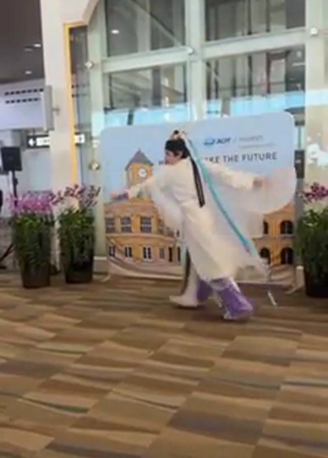 A person dressed in a Chinese-style traditional outfit is dancing in an airport
