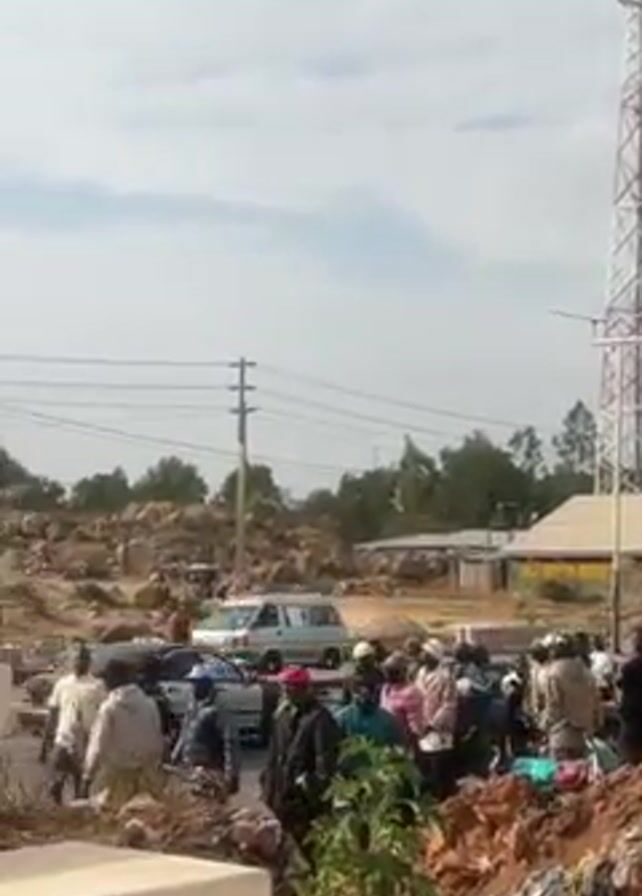 scene in an outdoor area. In the initial shot, a tall lattice-like communication tower is visible in the background, adjacent to a busy road with a number of people standing on the side. There is a dirt pile in the foreground. As the video pans to the left, a light-colored multi-story building comes into view. An ambulance can be seen in front of the building. A group of people are gathered near the building. The sky is partly cloudy.