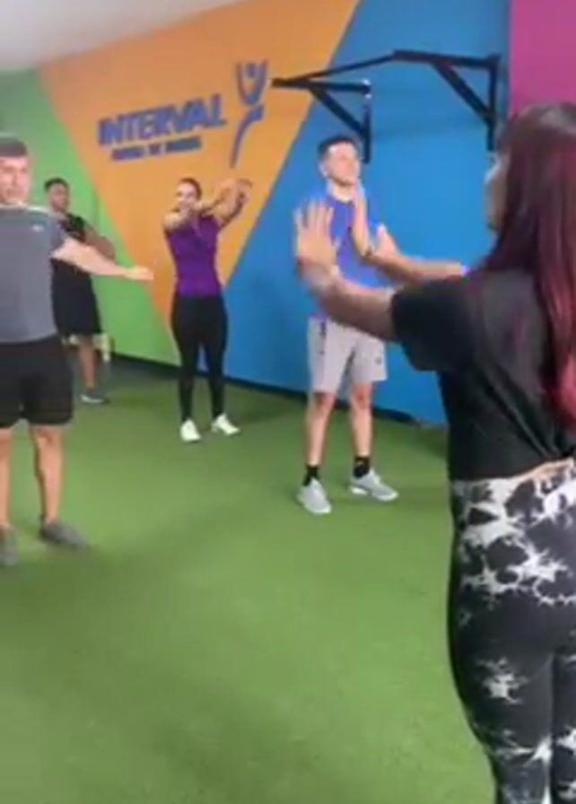 A group of people are doing a warm-up exercise with an instructor. The instructor is a woman with red hair, wearing a black t-shirt and grey and black tie-dye leggings. The other participants are a mix of men and women. Some are wearing t-shirts and shorts or leggings, while others are wearing workout clothes. The room has green artificial turf flooring and a blue and orange sign on the wall that reads "Interval." Some exercise equipment, including blue mats, is visible in the background. The instructor leads the group through arm exercises including raising the arms overhead.