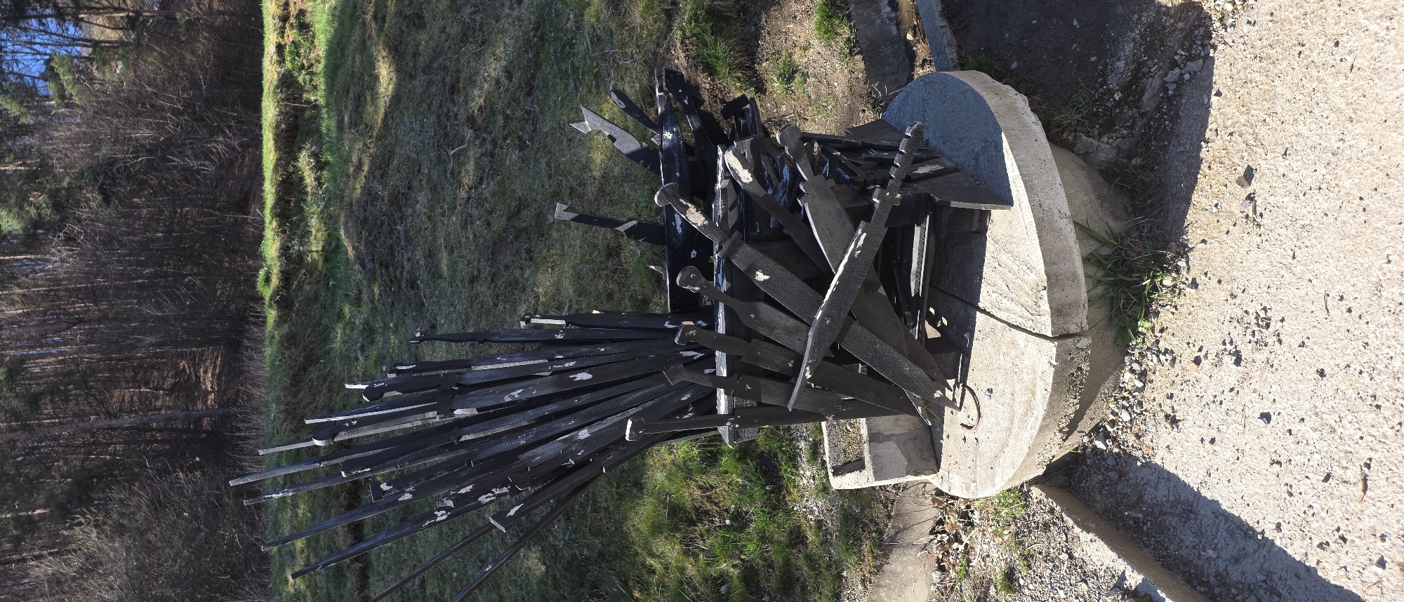 metal sculpture on a concrete base, situated in a grassy area near a wooded area