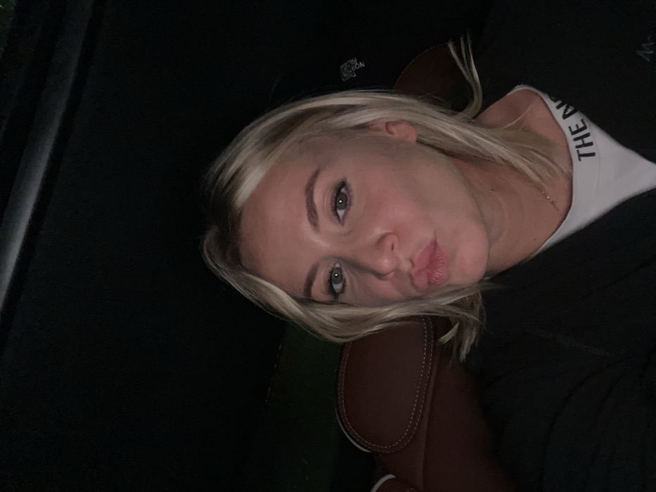 A blonde woman with light skin, blue eyes, and pursed lips is positioned at an angle, leaning against what appears to be a brown leather car seat. She's wearing a white tank top with the words "THE NOR" visible on the neckline and a black jacket or sweater. The background is dark, suggesting low lighting conditions, possibly inside a car at night. Her hair has blonde highlights and is styled in a loose, wavy manner.