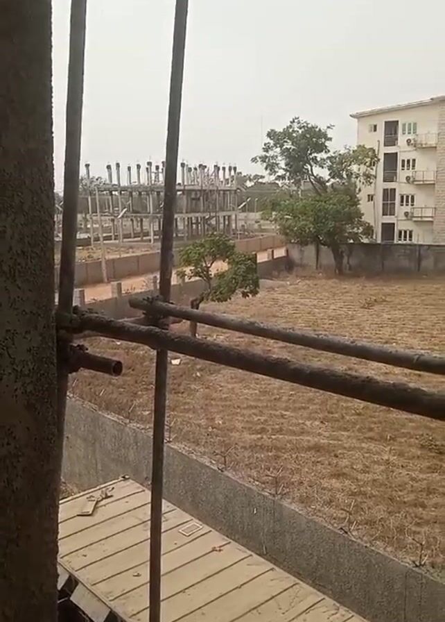 From behind metal scaffolding, the camera pans right across a dry field bordered by a concrete wall. Beyond the field are buildings, including a half-constructed skeleton of a large building and a completed, multi-story apartment building. A water tower is visible in the distance. The sky is overcast.