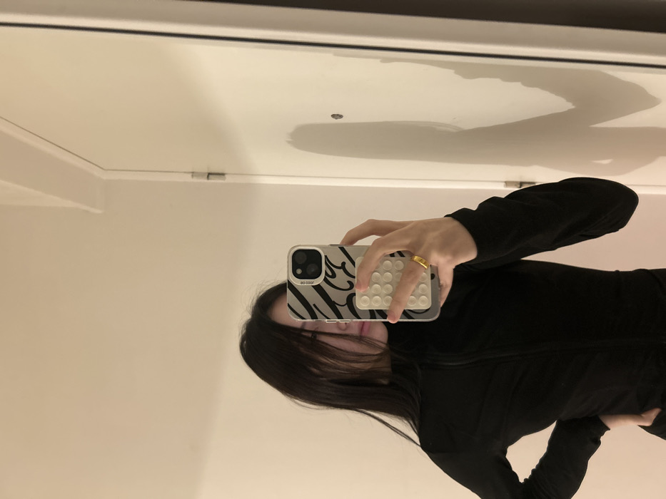 A reflection shows a person holding a phone, taking a photo in front of a mirror. The phone has a zebra-striped case with a circular, textured grip on the back. The person wears a black, long-sleeved top. Hints of long, dark hair are visible near the phone. The mirror reflects a plain white wall.