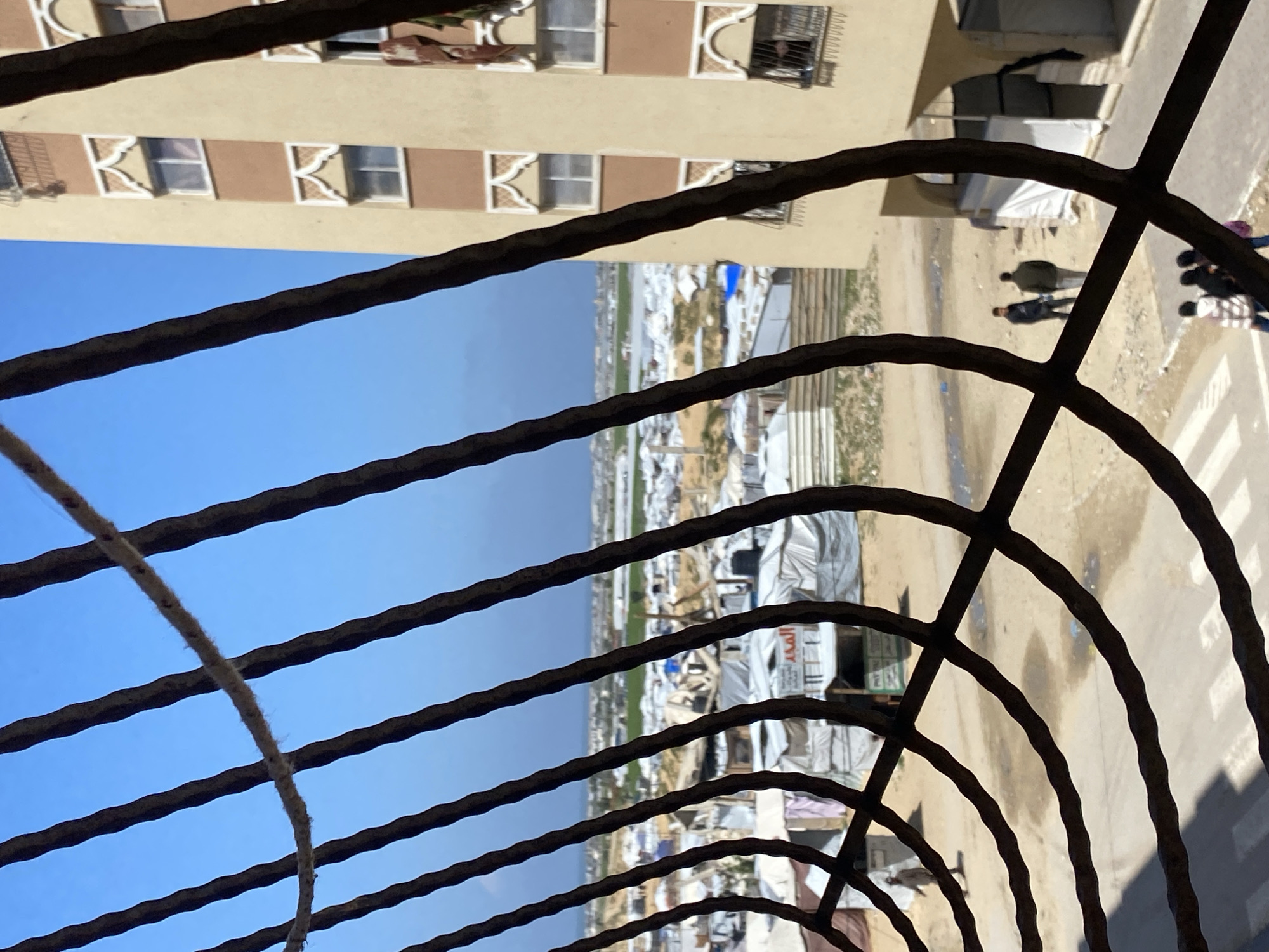 View from behind a dark, wrought iron balcony railing in Khan Yunis, Palestinian Territory. In the background, a blue sky transitions into an urban landscape with crowded tents, likely a refugee camp, spreading out towards the horizon. To the right of the tents, a sandy road or walkway is visible with several people walking along it. Above the tents to the left, there's a multi-story building with small, ornate windows. A thin, dirty rope runs diagonally across the railing in the foreground.