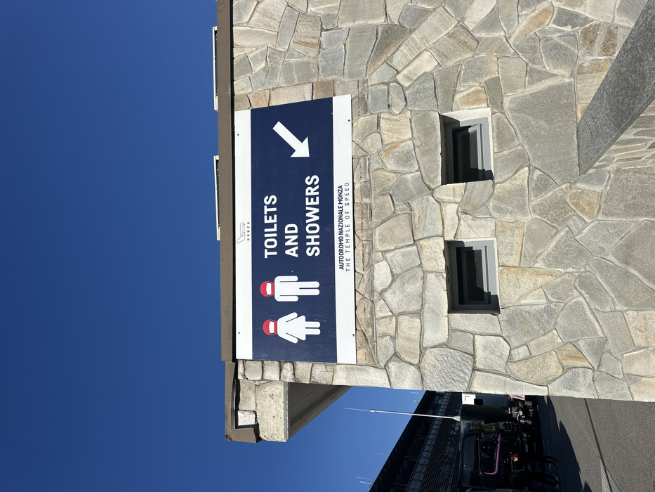 This image displays the exterior of a single-story building located at Autodromo Nazionale Monza in Monza, Italy. The building's facade is constructed from irregular, light-toned stone masonry. A rectangular sign with a dark blue background and white text is prominently mounted on the upper portion of the stone wall. The sign features two white stick figures, one female and one male, both wearing red racing helmets, positioned to the left of the text "TOILETS AND SHOWERS." A large white arrow points diagonally downwards to the right. Below this, the sign identifies the location as "AUTODROMO NAZIONALE MONZA" and "THE TEMPLE OF SPEED," with a small white stylized logo visible at the top center of the sign. Two small, horizontal windows with gray frames are set into the stone wall beneath the sign. The scene is illuminated by direct sunlight under a clear, vibrant blue sky. To the left of the building, a paved area is visible, where a large, dark semi-truck is parked, and a partially visible individual stands. In the distant background on the left, a multi-story building and a tall, slender antenna are discernible.