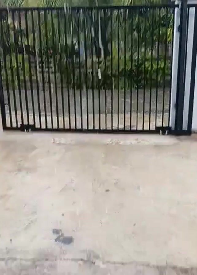 A black metal gate slides open in the rain. The gate is comprised of vertical bars and is mounted on a concrete surface. The gate is attached to a white pillar. A green, leafy background is visible through the gate.