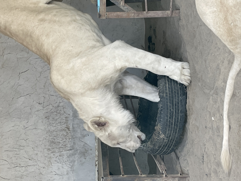 - "A white lion, light cream to pale yellow in color, is captured in an enclosure, drinking from a black, cut-down tire serving as a water basin" by FM-LYje72, licensed under CC BY 4.0