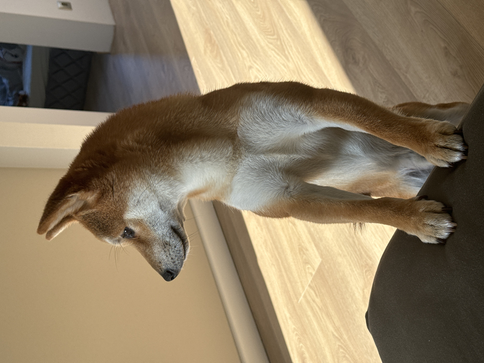 A Shiba Inu dog, predominantly reddish-brown with white markings on its chest, belly, and muzzle, stands on its hind legs with its front paws resting on a dark, upholstered surface in the lower left foreground. The dog's head is turned in profile to the left, looking out of frame. Its ears are erect and pointed. The immediate background features a light beige wall with a white baseboard, illuminated by natural light casting defined shadows on the light-colored wooden floor. In the distant background, an open doorway reveals a dimly lit interior room with a bed featuring a grey quilted headboard. An electrical outlet or light switch is visible on the wall to the right of the doorway. The scene is situated in Carnikava, Latvia.