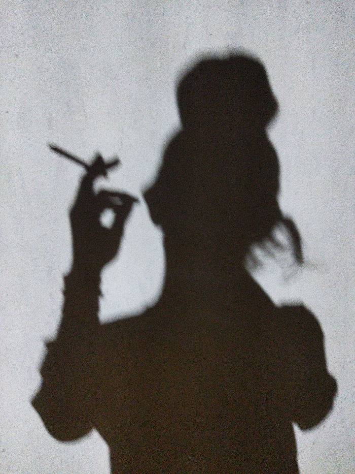 A dark, grainy silhouette of an individual, likely female, is projected against a textured, light gray surface in Tinaquillo, Venezuela. The silhouette's right hand is raised, holding a thin cylindrical object, consistent with a cigarette, between the index and middle fingers. A smaller, indeterminate object is also visible in the palm, held by the thumb and remaining fingers. The silhouette's head displays a hairstyle resembling a bun or ponytail at the crown, with some loose strands visible. The upper torso and shoulder are also discernible. No other subjects or objects are present in the visible scene.