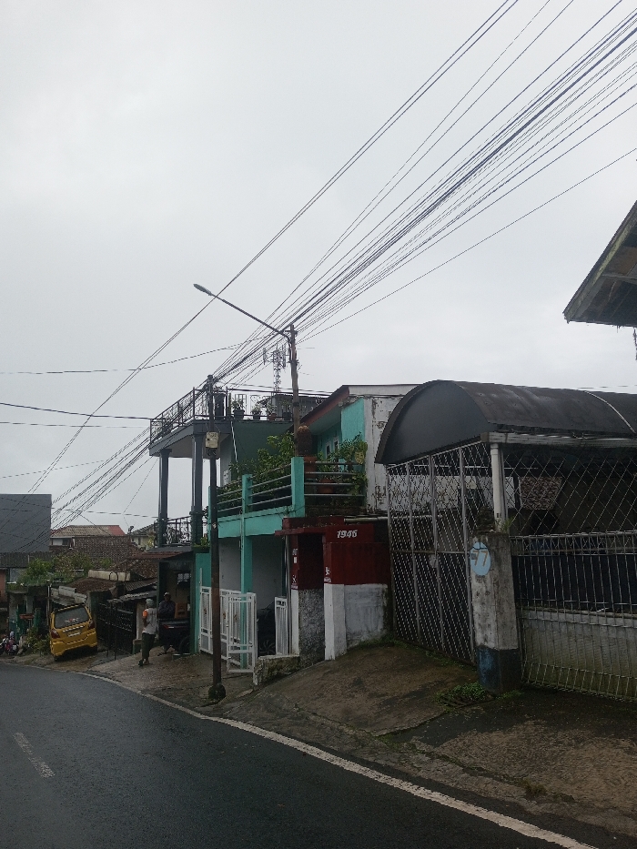 This image captures an overcast daytime street scene in Babaliya Mal., India. The foreground shows a damp, dark asphalt road with a faded white edge line. A prominent dark utility pole stands mid-left, supporting a street light and a dense array of black overhead electrical and communication wires that extend across the upper frame. On the left, a yellow compact car is parked on a lower, sloping road, partially obscured by structures. Further right on this lower level, two individuals are visible; one in a light-colored shirt is walking towards the left near a dark, indistinct vehicle. The central and right portions of the image are dominated by multi-story residential or mixed-use buildings. One structure features an elevated balcony supported by dark columns, equipped with a dark metal railing and potted plants; a single person is standing on this balcony. The building facade beneath this balcony is painted light blue/teal with white trim, featuring a white gate at ground level. Adjacent to it, another section of the building displays a dark red/maroon color with a white base, marked with the white numbers "1946." Green foliage is visible around this area, and a blue/teal railing is positioned above. To the far right, a structure with a dark, curved roof covers a wire-mesh gated area. A concrete pillar beside this gate features the number "77" within a blue circle. In the background, numerous houses with tiled roofs are visible across varying ground levels, indicative of a sloped, densely built-up environment. A smaller cellular tower or antenna structure is discernible behind the main utility pole.