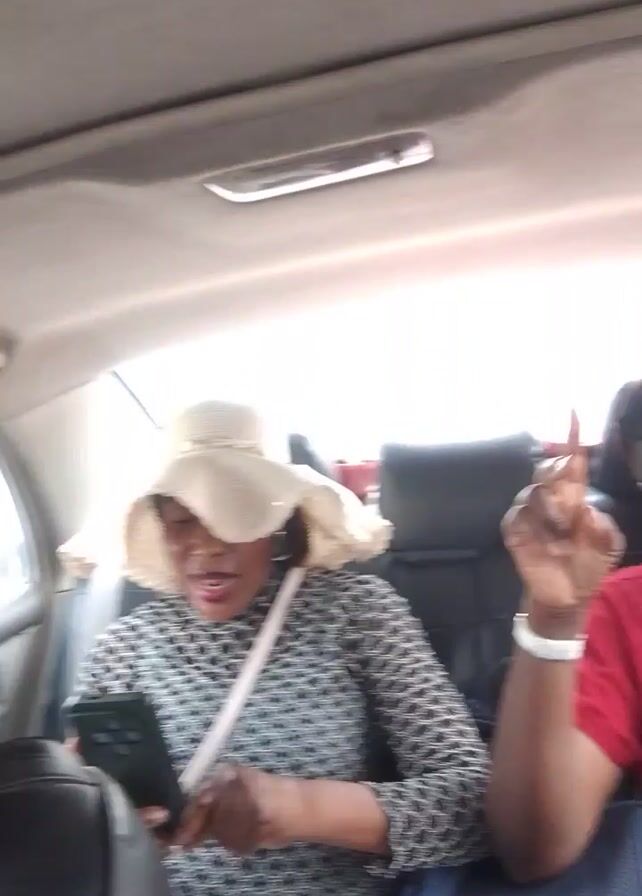 The video is shot from inside a vehicle with the camera rotating. In the first shot, an older woman wearing a red shirt makes a peace sign towards the camera. In the next shot, a woman wearing a patterned shirt and a white hat takes a video with her phone. A red purse is on the seat. In the final shot, a man smiles at the camera. The interior of the car is visible, and music is playing in the background.