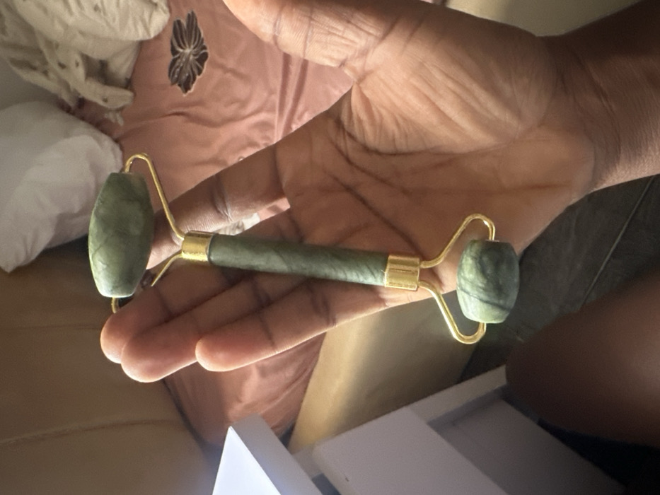 A dark-skinned right hand holds a green jade facial roller with gold-colored metal accents in a domestic setting in Abuja, Nigeria