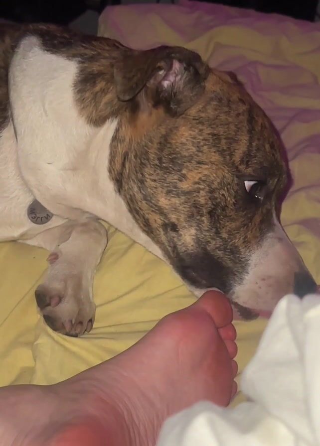 A dog lies on a yellow bedsheet and licks a person’s foot. The dog is mostly white with brown and black brindle markings on its head and body. It wears a silver identification tag. The person’s foot is reddened. A white sheet is partially visible. The setting appears to be indoors in a dimly lit room.