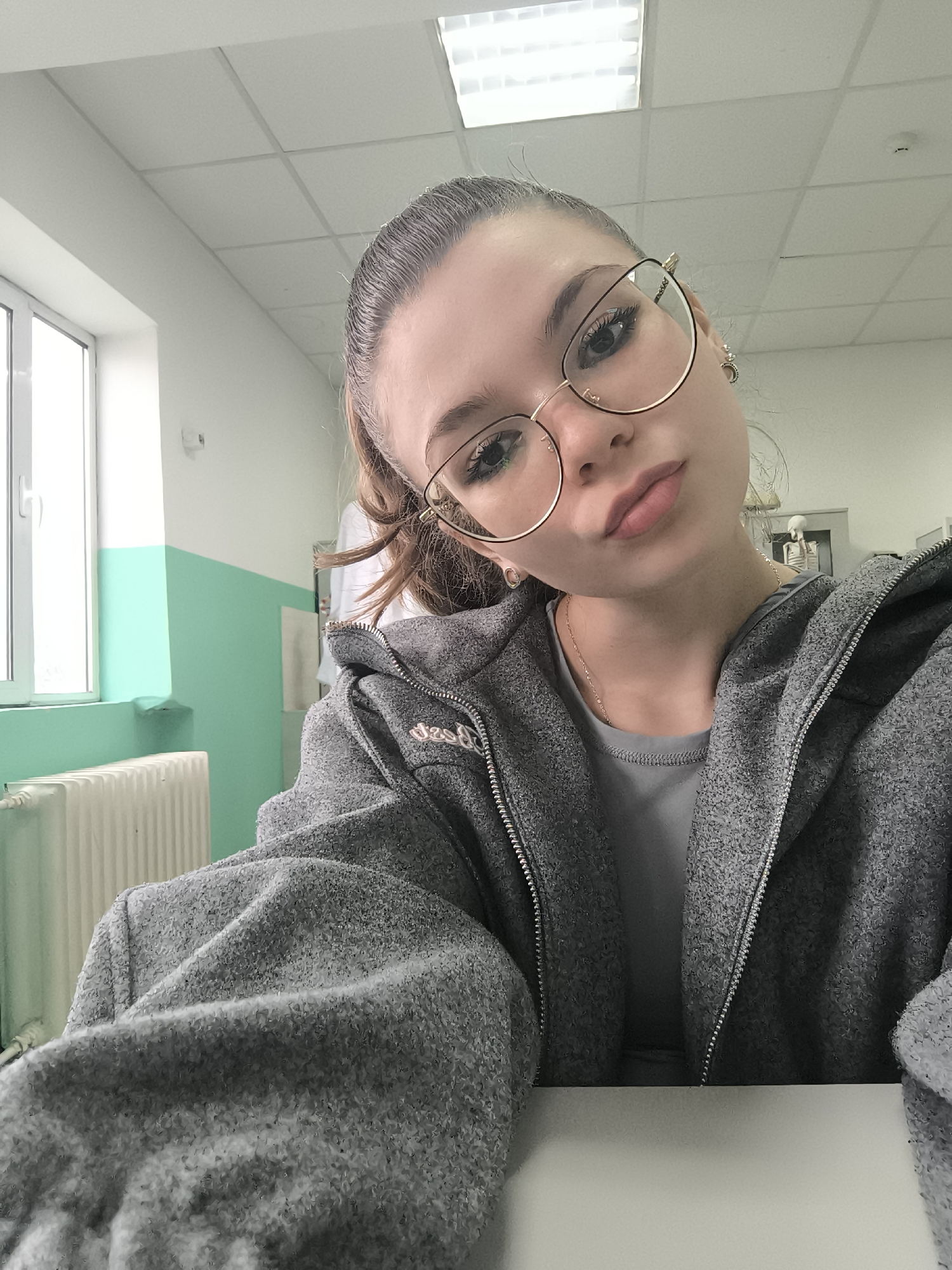 The scene is an interior room, likely a classroom or laboratory, located in Pernik, Bulgaria. The primary subject is a young female, approximately 18-25 years of age, positioned in the foreground, captured in a selfie. She has light skin, blue-green eyes, and light brown hair pulled back, wearing large, gold-framed, circular glasses. Her lips are slightly puckered. She wears a grey textured full-zip hooded sweatshirt with "DeeL" embroidered in pink on the left chest, over a plain light grey t-shirt. A thin gold chain necklace and a small hoop earring are present. She is seated at a light-colored table, the edge of which is visible at the bottom of the frame. The background features walls painted white on the upper section and mint green on the lower section. A white-framed window is visible on the left, with a white panel radiator beneath it. The ceiling is composed of white acoustic tiles, fitted with rectangular fluorescent light fixtures and a small red ceiling-mounted sensor or smoke detector. A human skeletal model, comprising a skull and partial torso, is discernible on a shelf in the background, to the right of the subject.