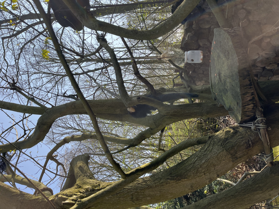 The image portrays an outdoor primate enclosure in Mechelen, Belgium, under bright, natural light. A white-faced saki monkey, identifiable by its black fur and distinct white head, is situated within the dense branches of a prominent deciduous tree, its body partially obscured. The monkey's right arm extends downwards along a thick branch. The environment is characterized by multiple bare-branched trees, interspersed with some exhibiting nascent green leaves, suggesting early spring. In the lower right, a large, circular wooden platform, cut from a tree trunk, is visible, with scattered orange food pellets on its surface. Suspended to the right of the monkey is a clear plastic jar with a white lid, containing additional orange food items, functioning as a feeder. Ropes and structural wooden elements are integrated into the tree infrastructure. A stacked log wall serves as a background barrier. The sky above is clear blue. No human subjects are present.