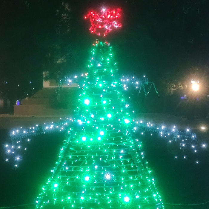 A brightly lit Christmas tree stands prominently in the dark