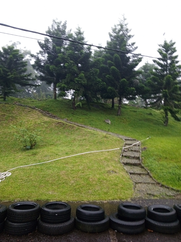 A grassy hill dotted with evergreen trees slopes upward under an overcast sky. A stone staircase climbs the hill, paralleled by a white hose. In the foreground, a row of stacked black tires rests on a dark surface, likely asphalt or concrete. The overall scene suggests a park or recreational area with a slightly overgrown, naturalistic aesthetic.