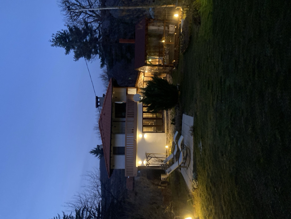 The image depicts an illuminated residential property at dusk in the City of Unknown, Unknown. A two-story house with white exterior walls and a red tiled roof stands centrally, featuring a ground-floor patio with double glass doors, flanked by two upward-facing wall lights. A wooden-railed balcony is on the second floor. A satellite dish is mounted on the front facade. To the right of the house, an attached or adjacent outdoor living structure with a matching red tiled roof is visible, with interior lighting illuminating a furnished space through clear paneling. In the foreground, a manicured green lawn is partially illuminated by several spherical garden lights. A light-colored patio slab on the left holds two reclinable lounge chairs. A decorative metal archway is positioned near the house's ground level. Bare deciduous trees and evergreen trees are present in the background and surrounding the property, which is situated against a dark, hilly landscape under a deep blue twilight sky. No individuals or active interactions are present in the scene.