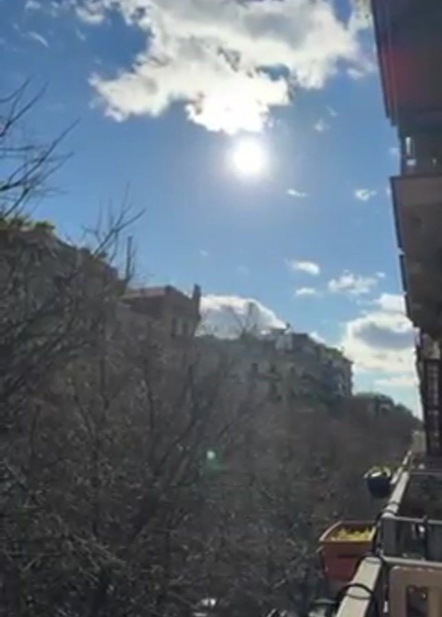 bright sunny day with a blue sky and scattered white clouds. The sun is shining brightly in the sky, partially obscured by the clouds. The view is from a balcony, with a railing visible in the foreground. Across the street are buildings with balconies and windows, partially obscured by leafless trees. Traffic sounds can be heard.