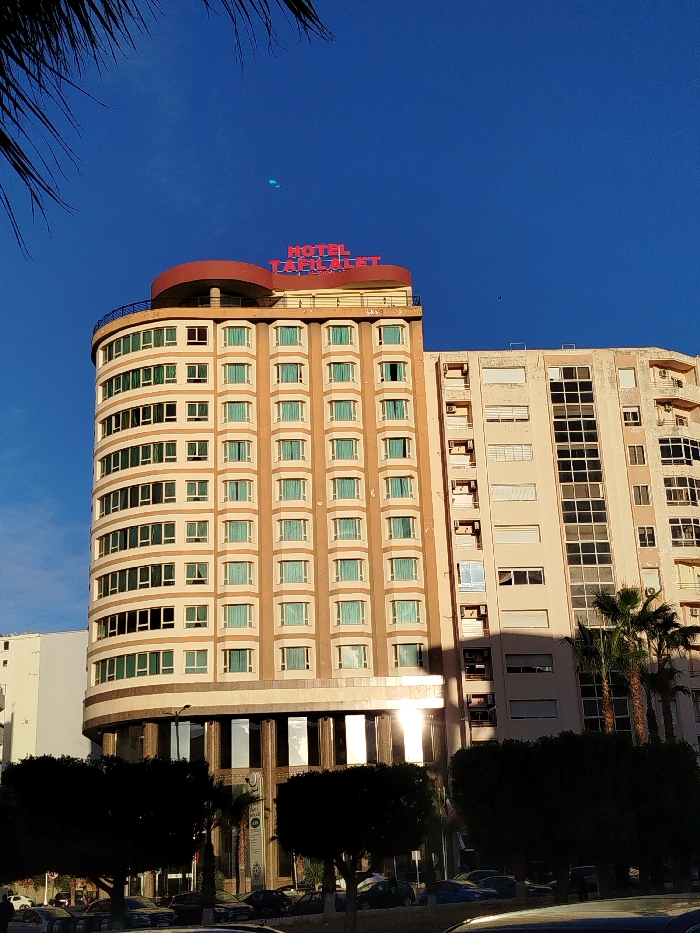 - "A daytime photograph depicts the Hotel Tafilalet in Meknes, Morocco, under a clear blue sky" by FM-68wXo2, licensed under CC BY 4.0