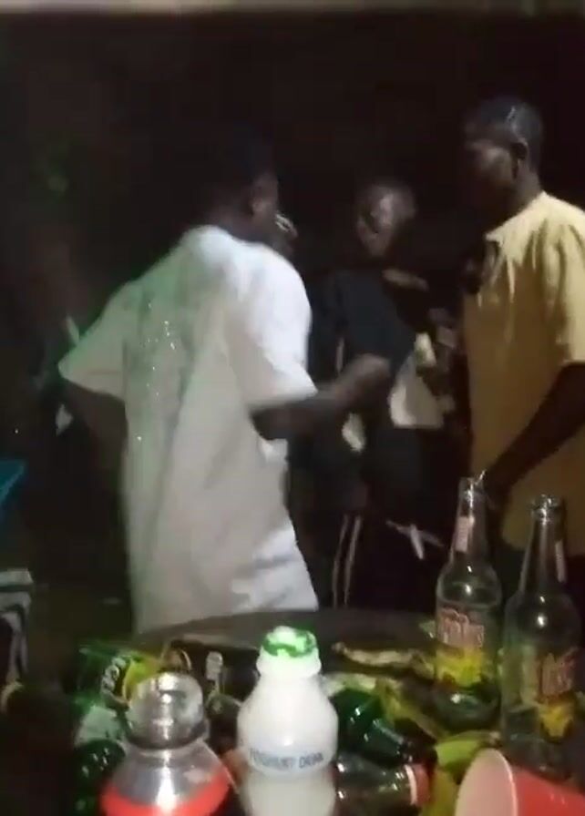 Here's a brief description of the video: The video shows a group of people at what appears to be a party. Several individuals are standing and seem to be dancing. A man in a light blue Lakers jersey faces the camera at one point. There are also bottles of beer and other beverages on a table in the foreground. The setting appears to be outdoors, possibly at night, with somewhat dim lighting.