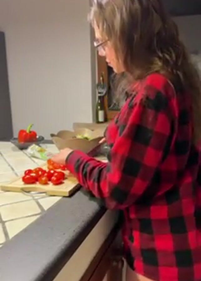 In a kitchen setting, a woman with long hair and wearing glasses and a red and black plaid shirt is preparing food. She stands at a kitchen counter that has a black edge and a white tiled surface. She is cutting tomatoes on a wooden cutting board. There's a bowl of lettuce on the counter to her right. A red pepper sits on a small white plate in the background. A bottle of wine can be seen through a window behind her. The woman is focused on cutting the tomatoes and placing them in the salad bowl.