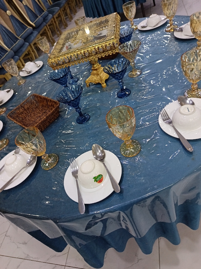 A decorated round table is covered with a blue vinyl tablecloth. Place settings include white plates with small bowls turned upside down, forks, and spoons. Each setting also has a decorative glass, some in blue and others in gold. A brown wicker basket sits near one setting. An ornate gold-colored centerpiece is placed near the center of the table. Blue-upholstered chairs line the background.