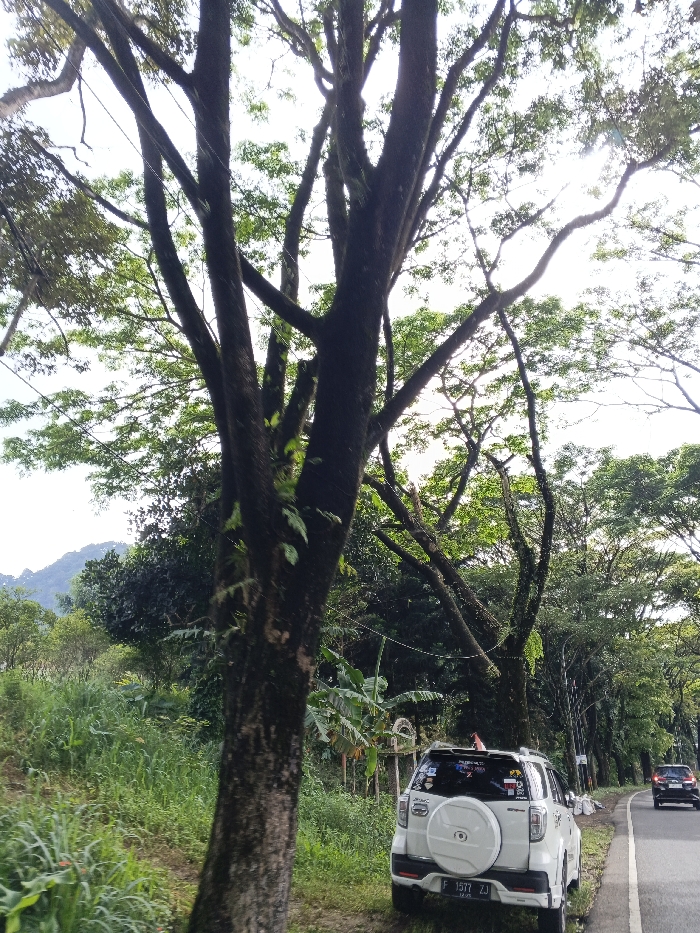 A verdant scene unfolds with a towering tree taking center stage. Lush greenery extends to the left, contrasting with a parked white SUV and passing cars on the right. Sunlight filters through the dense canopy, creating a dappled effect. A distant hill adds depth to the landscape. The overall impression is one of nature's abundance alongside human presence.