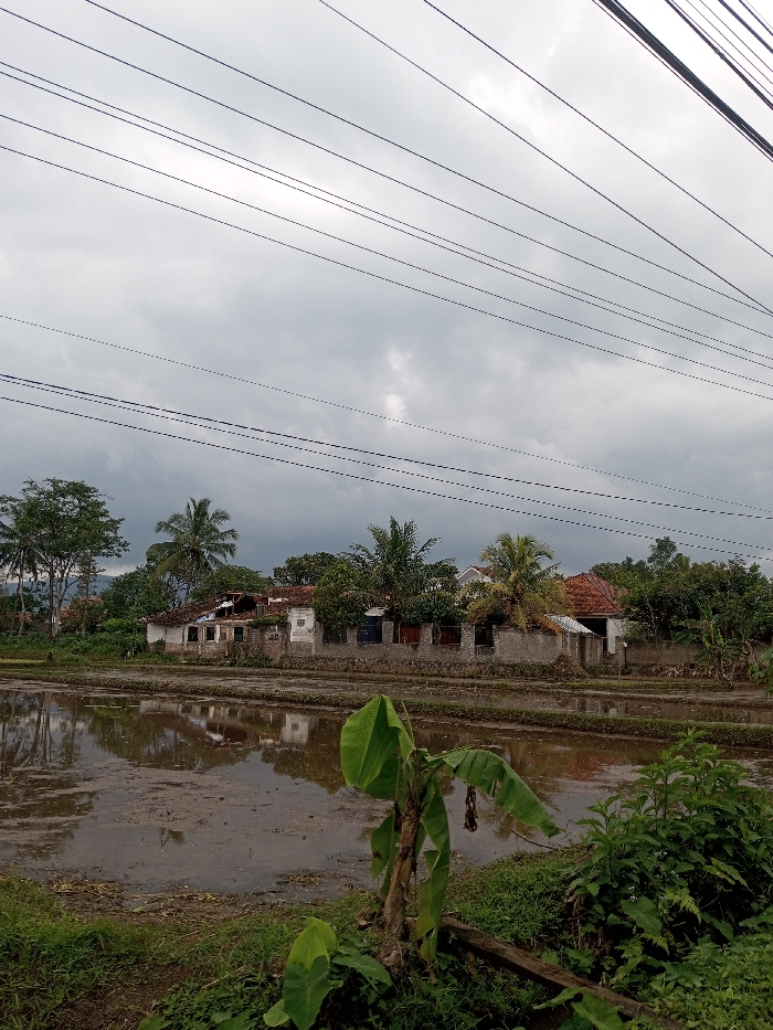The image captures an outdoor scene in Khajuripada, India, under an overcast sky. Multiple parallel overhead utility lines traverse the upper sky diagonally from left to right. In the foreground, ground-level vegetation, including a prominent young banana plant with large green leaves, occupies the lower portion of the frame. A dark wooden plank lies horizontally on the ground to the lower right. The midground features a large, flooded paddy field reflecting the gray sky and distant elements. Beyond the field, a row of structures is visible, bordered by a low concrete or stone wall. These structures exhibit varying conditions; one house towards the left appears partially dilapidated with an exposed roof frame and multiple open window apertures, while others have reddish-brown tiled roofs. Lush green trees, including palm trees, densely surround and partially obscure the buildings. Faint outlines of distant hills are visible on the far left horizon. No human figures or explicit actions are present.