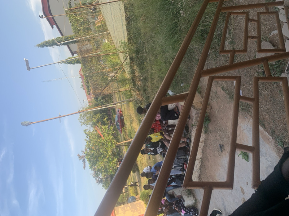 The scene depicts an outdoor gathering in the city of Dabawa, Nigeria, viewed from an elevated position behind a brown-painted metal railing with geometric rectangular patterns. In the midground, a group of approximately 15-20 individuals, primarily young adults and adolescents, are seated on concrete steps or a low wall to the left. They are casually dressed, with several appearing to be engaged in conversation, some laughing or smiling. One individual in black attire is seated at the far right of the group. Beyond the seated group, the ground is a mix of dry earth and sparse, reedy grass. A red sedan is parked further back on a dirt or unpaved surface, and a single individual in dark clothing walks near the vehicle. The background features various structures and vegetation. Two tall poles with light fixtures, likely streetlights, stand prominently. One pole, possibly a communication antenna, is also visible. A chain-link fence separates the immediate area from a more manicured green space, possibly a sports court, with visible white markings. Buildings with reddish-brown roofs and light-colored walls are present in the far background. Numerous green trees and shrubs are scattered across the landscape. The sky is clear blue with soft sunlight, suggesting daylight conditions, possibly late afternoon.