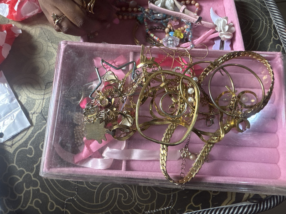 The scene depicts a collection of assorted jewelry contained within a pink-velvet-lined clear plastic jewelry box, resting on a dark patterned fabric surface in a residential setting in Asipa, Nigeria