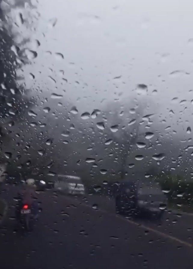A stationary view from inside a car shows a rain-streaked windshield with raindrops obscuring the view